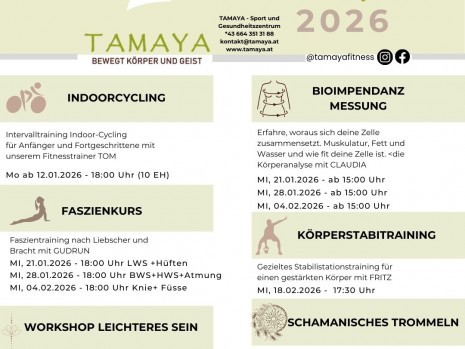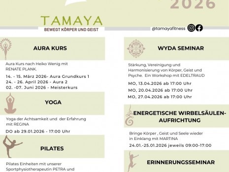 Im Tamaya finden dein Körper und Geist wieder in die Mitte. Ob sportliches Workout im weitläufigen Fitnessbereich, wohltuende Handgriffe bei der Massage, heilende Therapien oder entspannende Momente im Wellnessbereich – im Tamaya Sport- und Gesundheitszentrum bist du gut aufgehoben.Deine nächsten Kurse