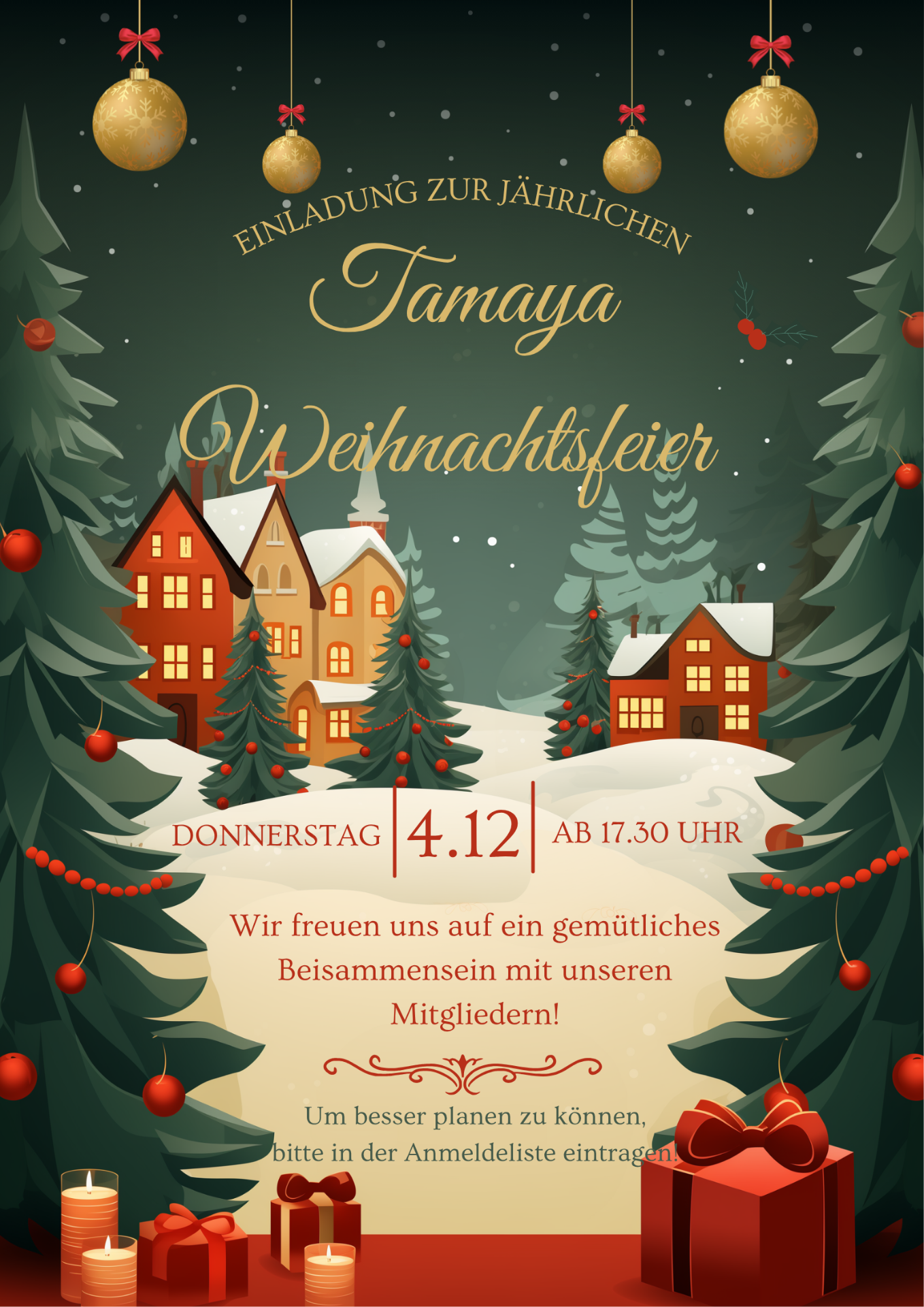 Auch heuer freuen wir uns darauf, unsere TAMAYA Mitglieder zur jährlichen Weihnachtsfeier einladen zu dürfen!