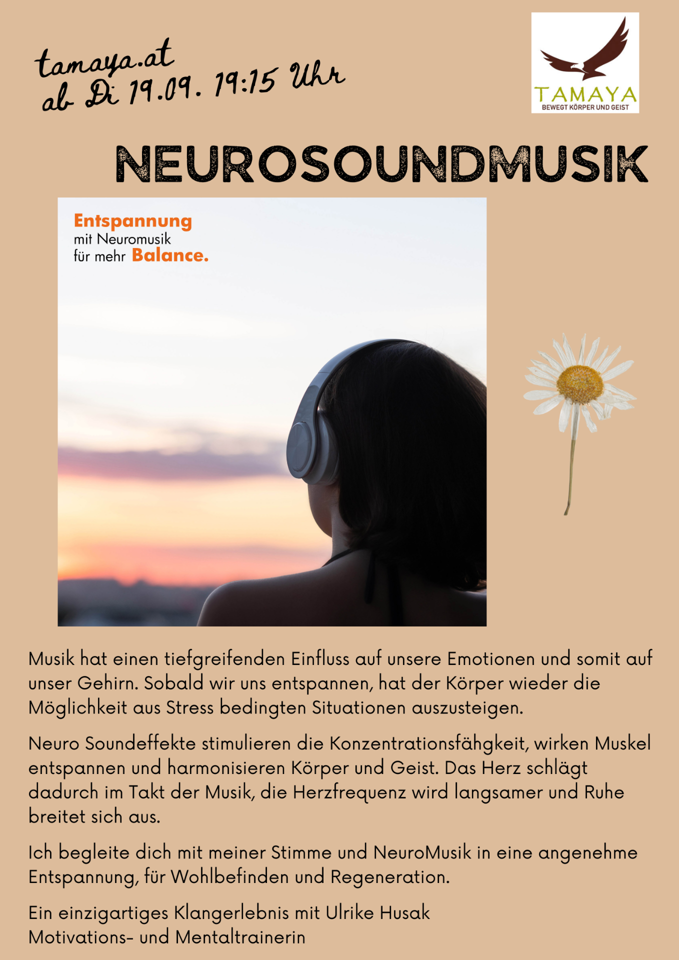ICH BEGLIETE DICH MIT MEINER STIMME UND NEUROMUSIK IN EINE ANGENEHME ENTSPANNUNG. DU ERLEBST EIN VOLLKOMMEN NEUES GEFÜHL VON WOHLBEFINDEN UND REGENERATION.