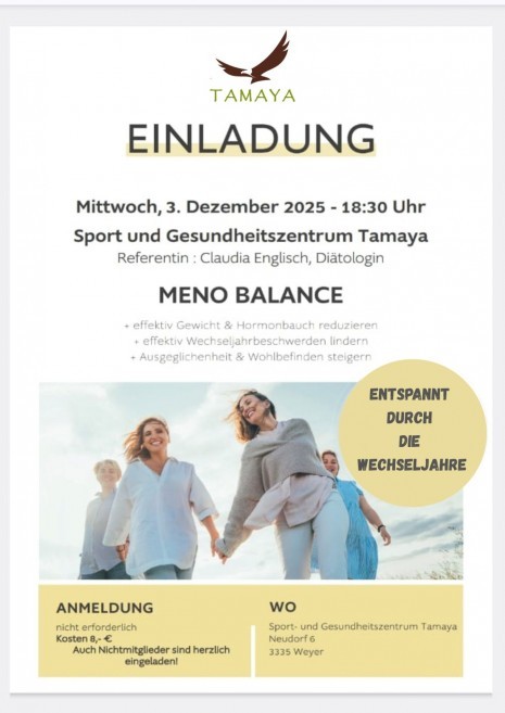 Menopause, Gewichtsmanagement, Hormonbalance, Wohlbefinden - all diese Schlagwörter werden beim Vortrag von Diätologin und Ernährungscoach Claudia aufgegriffen und Frauen ein wertvoller Leitfaden in die Hand gegeben, wie man vor und während der Menopause in seine Balance findet.